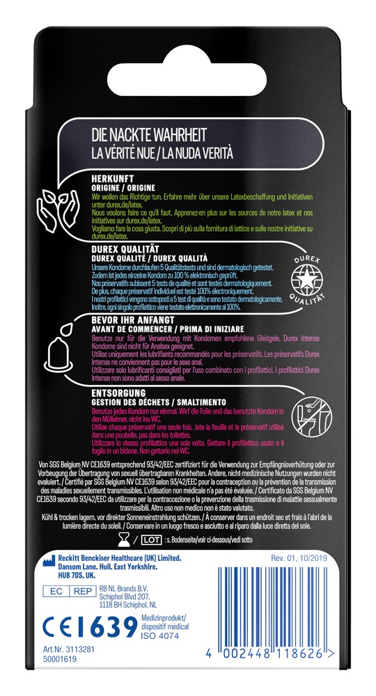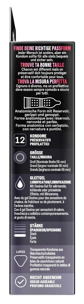 Prezerwatywy lateksowe z żeberkami, nubsami i stymulującym żelem Desirex o działaniu rozgrzewającym, chłodzącym i mrowiejącym. Z miętowym aromatem. Idealne dopasowanie dla wygodnego dopasowania i intensywnych wrażeń. Przezroczysty i nawilżony na silikonowym podłożu. Ze zbiornikiem. Długość całkowita 205 mm, szerokość nominalna: 56 mm. 12 kawałków.