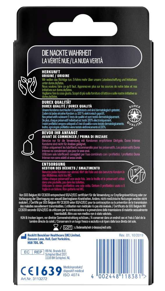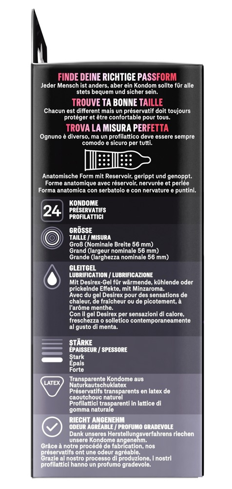 Prezerwatywy lateksowe z żeberkami, nubsami i stymulującym żelem Desirex o działaniu rozgrzewającym, chłodzącym i mrowiejącym. Z miętowym aromatem. Idealne dopasowanie dla wygodnego dopasowania i intensywnych wrażeń. Przezroczysty i nawilżony na silikonowym podłożu. Ze zbiornikiem. Długość całkowita 205 mm, szerokość nominalna: 56 mm. 24 sztuki.