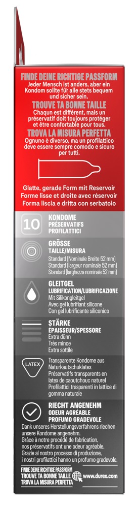 Przezroczyste prezerwatywy waflowe wykonane z lateksu z naturalnej gumy z 20% cieńszym materiałem na końcówce dla szczególnie intensywnych doznań. Z łatwym dopasowaniem dla idealnego dopasowania i łatwiejszym rozwijaniem. Ze zbiornikiem i powłoką nawilżającą na bazie silikonu.