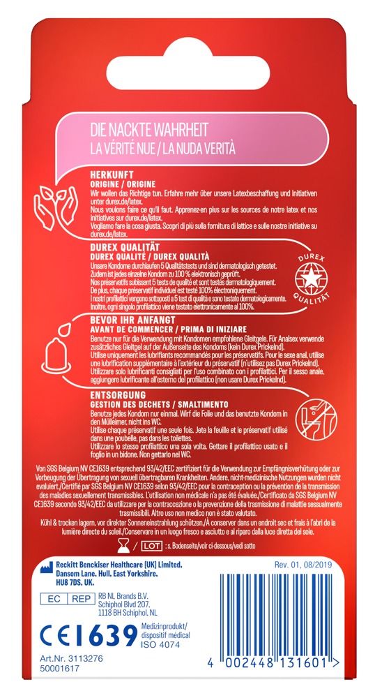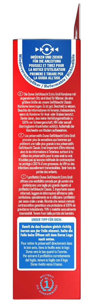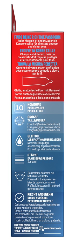 Wyprofilowane, bardzo cienkie i przezroczyste prezerwatywy Durex Extra Large wykonane z naturalnego lateksu gumowego są obecnie największymi prezerwatywami na rynku i charakteryzują się łatwym dopasowaniem dla lepszego dopasowania i łatwiejszym rozwijaniem. Z silikonową powłoką na mokro i zbiornikiem. Wymiary: 220 mm długości (zwykle 180 mm). Szerokość nominalna 57 mm (zwykle 52 mm).