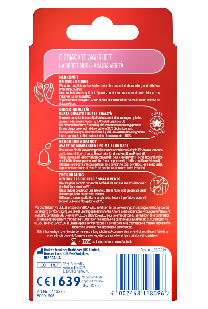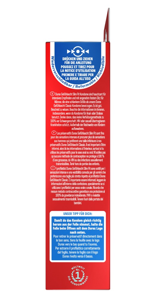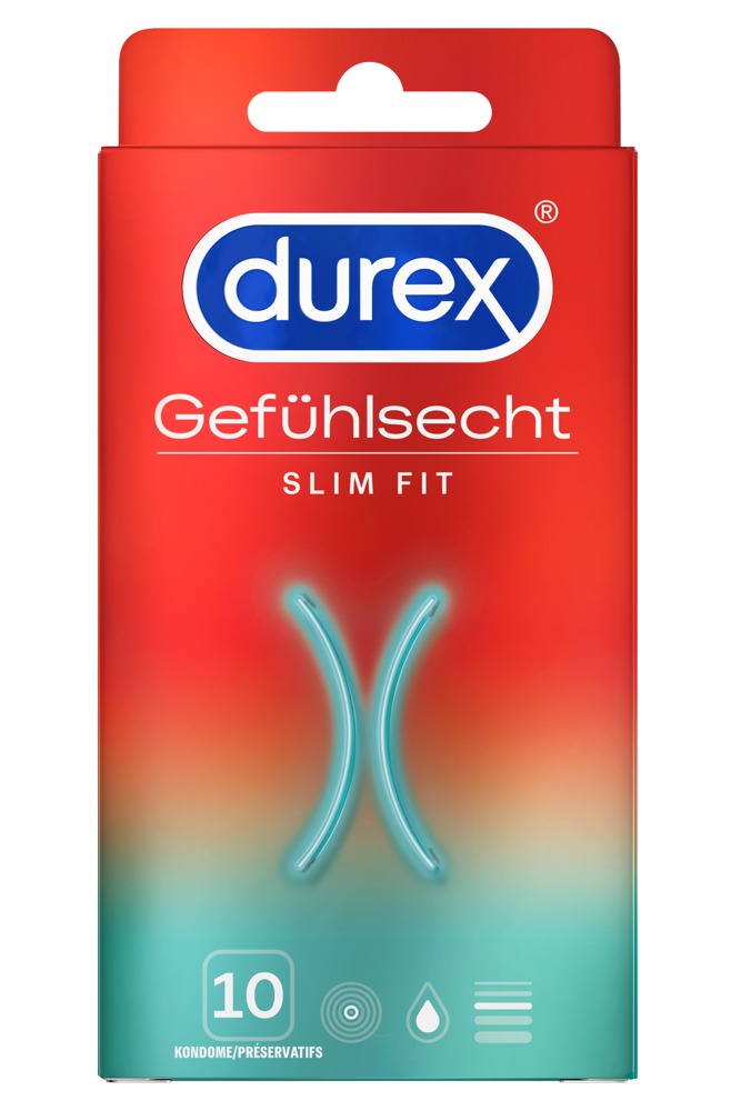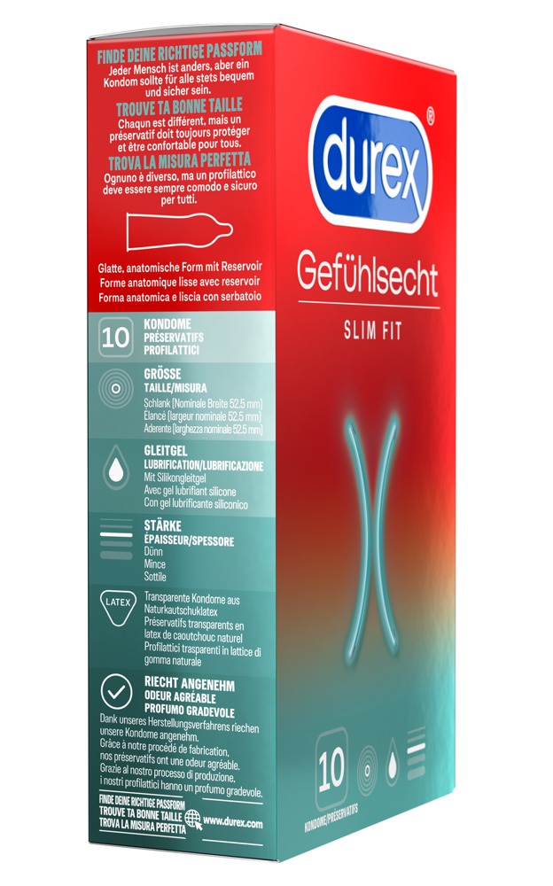 Przezroczyste i cienkie waflowe prezerwatywy Durex Slim Fit wykonane z naturalnego lateksu gumowego mają przekonującą, wilgotną powłokę na silikonowej podstawie i zbiorniku. Wymiary: 190 mm długości (zwykle 180 mm). Szerokość nominalna 52,5 mm.