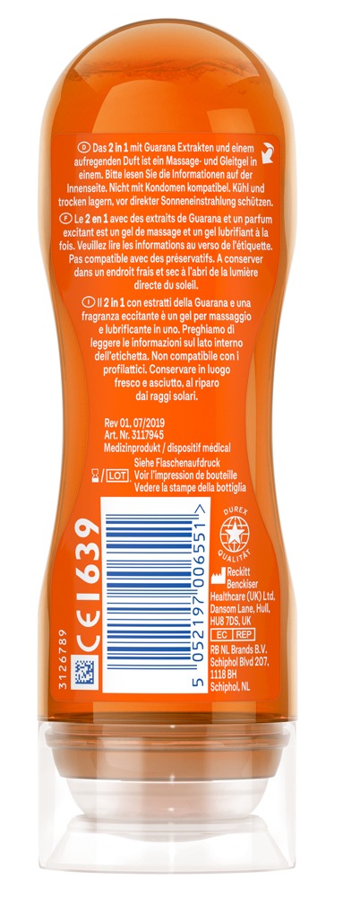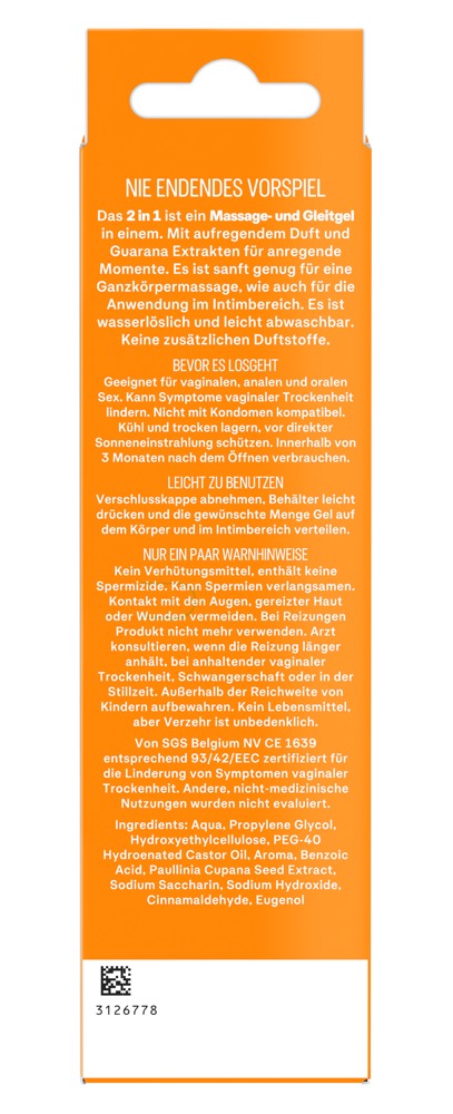 Żel i smar do masażu w jednym dla intensywnej i namiętnej zabawy miłosnej. Na bazie wody i z pobudzającym ekstraktem z guarany. Nadaje się do seksu pochwowego, analnego i oralnego. Nie używać z prezerwatywami. Można prać.
