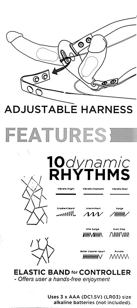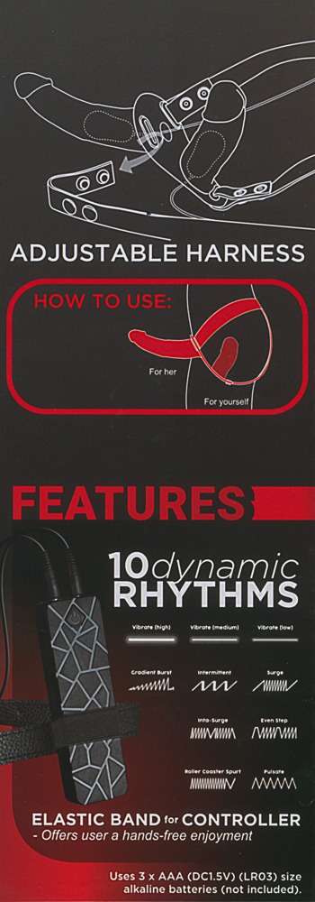 Czarny wibrator strap-on z dużym wibratorem na zewnątrz i małym wibratorem wewnątrz. Duży wibrator (dł. 17 cm, Ø 3-4,3 cm) jest lekko zakrzywiony i służy do penetracji części pasywnej, mały wibrator (dł. 9,3 cm, Ø 3,8-4,2 cm) służy do penetracji własnej (część aktywna). Oba wibratory z wyraźną żołędzią i zaznaczonymi żyłkami oraz 10 trybami wibracji, sterowanymi za pomocą przewodowego pilota, który można wpiąć w małą pętelkę na pasie biodrowym, dzięki czemu ręce pozostają wolne. Obwód pasa biodrowego jest regulowany w 12 stopniach od 78 cm do 108 cm, stringi mają 96 cm długości i są płynnie regulowane. Baterie prosimy zamawiać osobno: 3x Micro/AAA.
