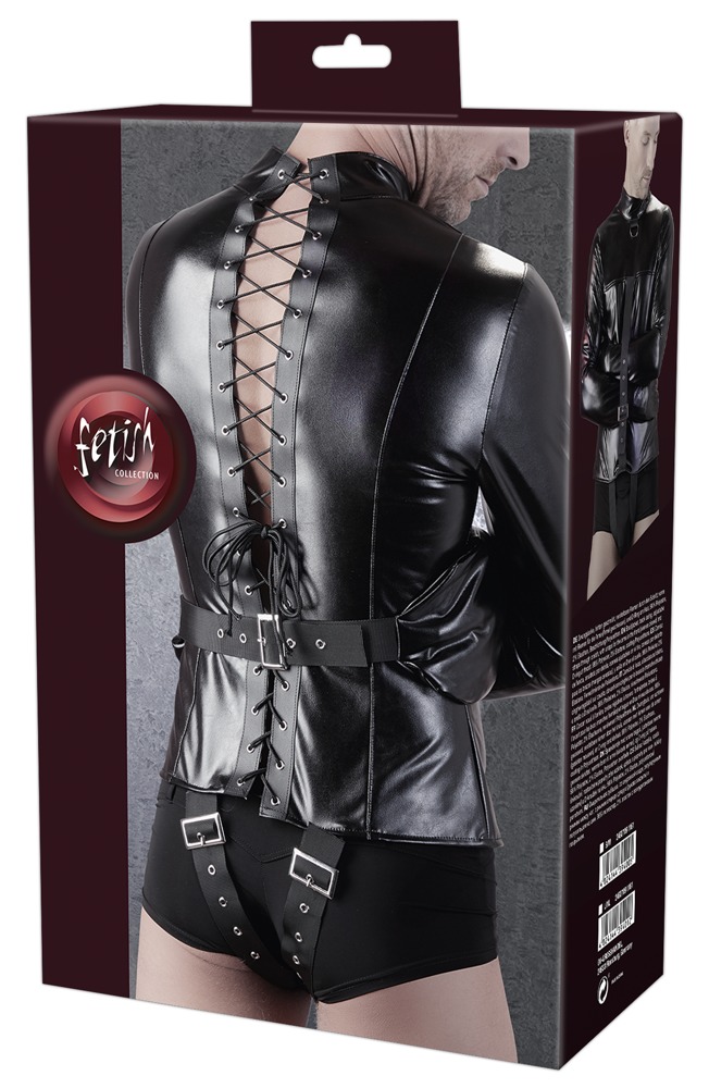 Kaftanik z regulowanym paskiem w kroku. Wyjątkowo długie rękawy wyposażone są w dodatkowe klamry. Pasek mocujący do ramion z przodu dodatkowo zabezpiecza Fesslung. Stopień zwężenia można również regulować za pomocą ciągłego sznurowania z tyłu. Dzięki elastycznej imitacji skóry kaftanik oferuje szlachetną optykę. Elegancka stójka i D-ring z przodu sprawiają, że wygląd bondage jest idealny.