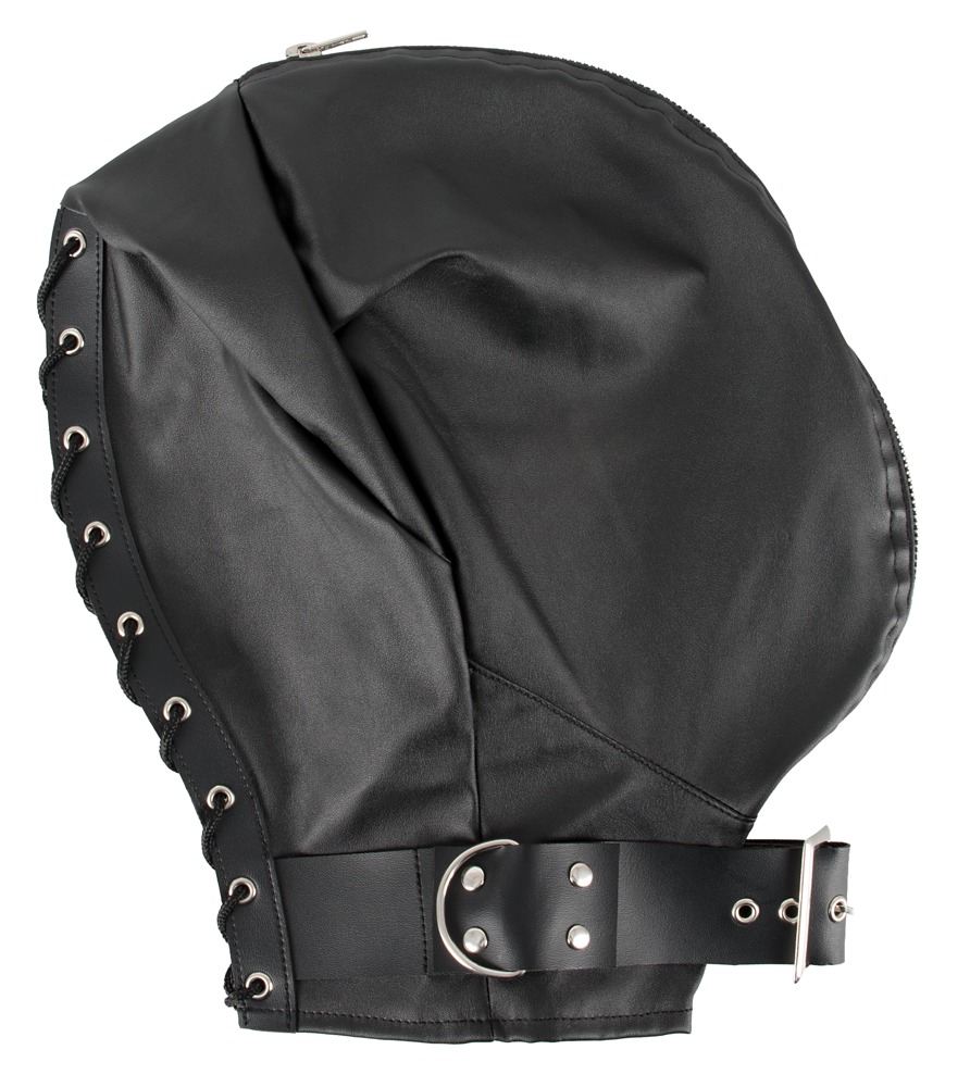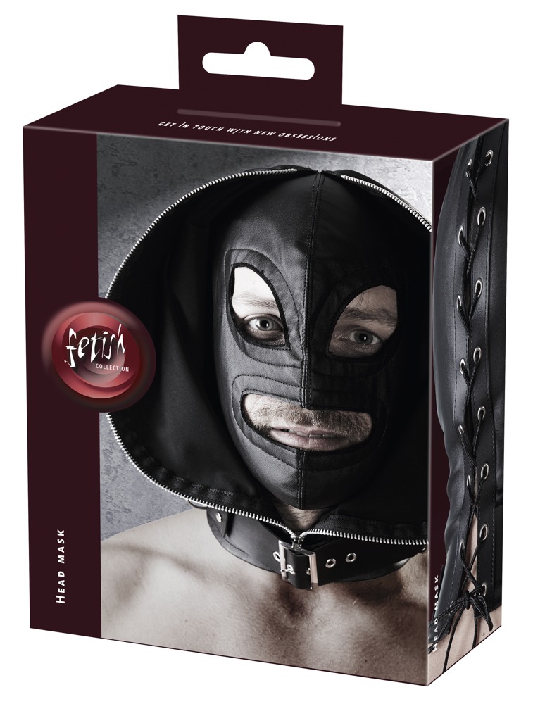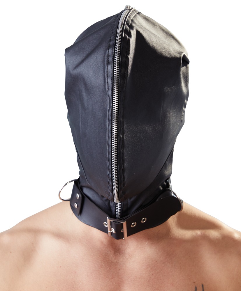 Podwójna maska na głowę wykonana z czarnej imitacji skóry. Maska wewnętrzna z otworem na oczy i usta. Zewnętrzna maska z zamkiem błyskawicznym z przodu i sznurowaniem z tyłu. Kiedy zewnętrzna maska jest zamknięta, oddychanie jest ograniczone, co zwiększa powab absolutnej uległości.