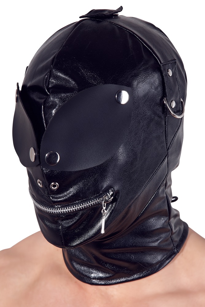 Jeśli nosisz tę czarną, elastyczną, skórzaną maskę imitującą głowę, niektórzy ludzie zadadzą sobie to pytanie! Opaski na oczy można rozpiąć, a suwak na ustach, który można zamknąć, decyduje o mówieniu i ciszy. Z dwoma oczkami nad nozdrzami i sznurowaniem z tyłu. Pierścienie dekoracyjne na górze i po bokach. 98% poliester, 2% elastan z powłoką poliuretanową.