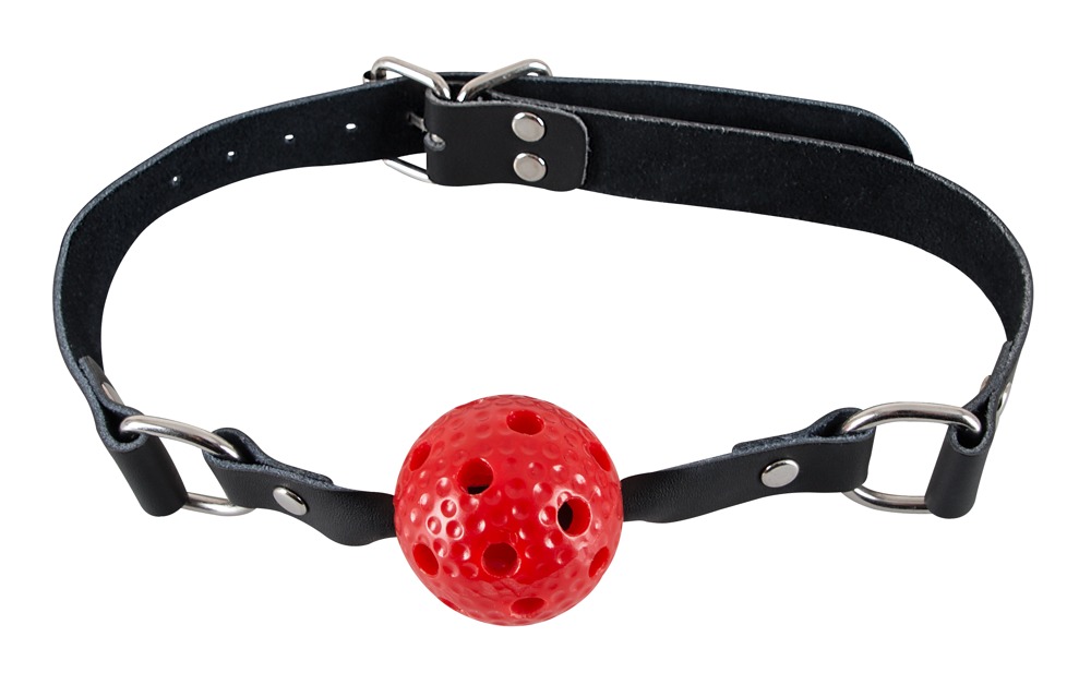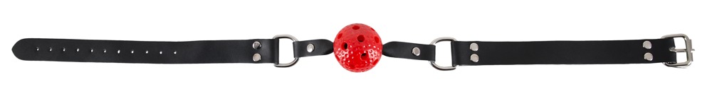Twardy knebel o wyglądzie piłki golfowej (Ø ok. 4 cm) z otworami powietrznymi na regulowanym pasku na głowę. Czarny/czerwony. Poliuretan, gag: polichlorek (winyl).