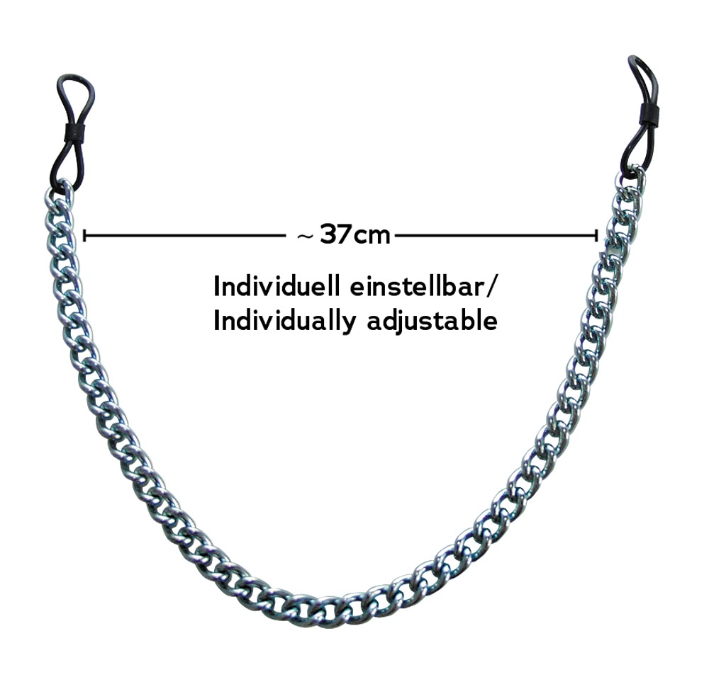 Ta biżuteria na biust bez przekłuwania oferuje ultra seksowny wygląd - i daje przyjemne uczucie mrowienia. Końcowe pętle są po prostu zakładane wokół sutków i delikatnie, ale mocno dokręcane (bez przebijania!). Srebrny, metalowy łańcuszek o długości 34 cm z czarnymi pętlami na sutki do odciągania sutków. Waga: 50 g.