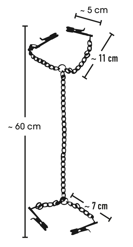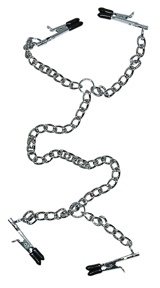 Ciężki "pistolet" dla niegrzecznych dziewczyn! Dwa klipsy do sutków i dwa klipsy do sutków sromowych połączone są mocnymi łańcuchami. Klipsy delikatnie ząbkowane, z wyjmowanymi osłonami ochronnymi. Metal w kolorze srebrnym.