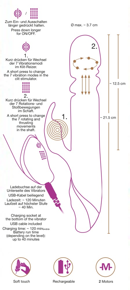 Wibrator Pearl z 7 silnymi trybami wibracji w króliczym stymulatorze łechtaczki w kształcie królika. Dodatkowo, końcówka wału rozpieszcza strefę G z 7 trybami uderzenia w połączeniu ze zmysłowymi perłami wirującymi wewnątrz. Dla zróżnicowanej przyjemności, funkcja wibracji i popychania może być sterowana oddzielnie. Możliwość ładowania za pomocą dołączonego kabla USB.