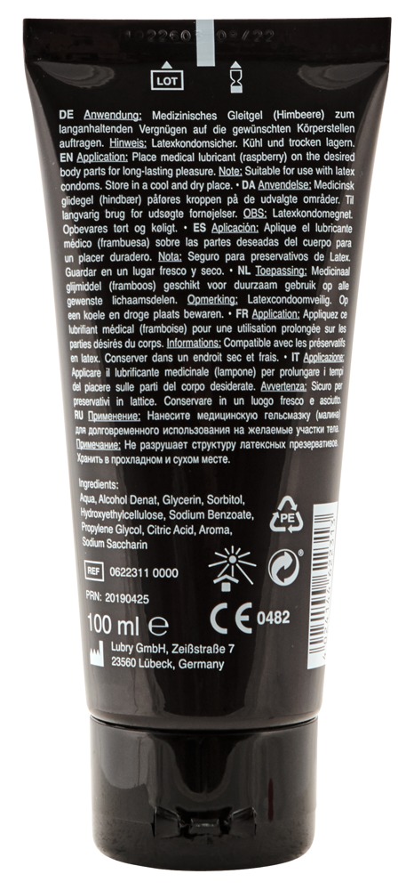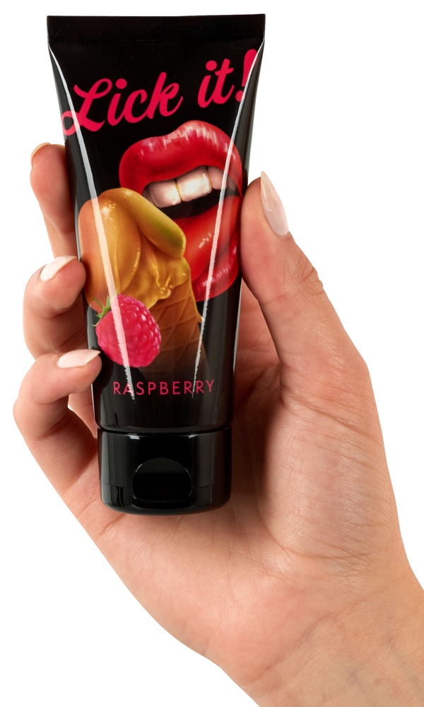 Żel do masażu na bazie wody o zapachu i aromacie malinowym do masażu i/lub seksu oralnego.