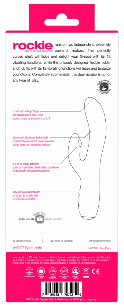 Jedwabiście gładki wibrator króliczek z ergonomicznie ukształtowaną końcówką do punktu G i ściągaczem łechtaczki z noskiem stymulującym. Z 2 potężnymi silnikami i 12 cichymi jak szept trybami wibracji w każdym z dwóch końców wału, które mogą być kontrolowane oddzielnie. Komfortowa funkcja pamięci automatycznie powtarza ostatni tryb pracy przed wyłączeniem. Przyjemnie elastyczny i ładowany za pomocą dołączonego kabla USB do ładowania. Blokada podróżna. Wodoodporny.