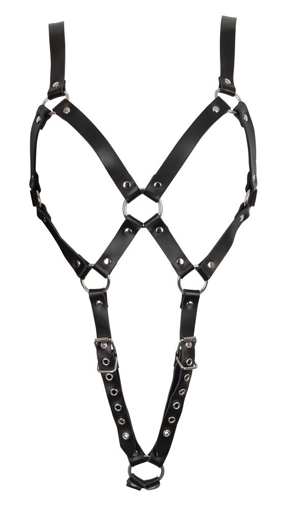 Uprząż wykonana z pasków skórzanych i pierścieni łączących. Zapięcia na klamry z tyłu i z przodu z możliwością wielokrotnej regulacji.