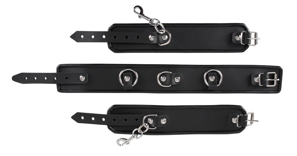 Zestaw mankietów składający się z dwóch kajdanek i jednego mankietu na szyję. Kajdanki mogą być przymocowane do mankietu szyjnego za pomocą karabinków. Ma też pierścienie z boku i D-ring z przodu. Krawędzie mankietów są obrzeżone. Czarny. Materiał: dwoina skórzana, metal (chromowana).
