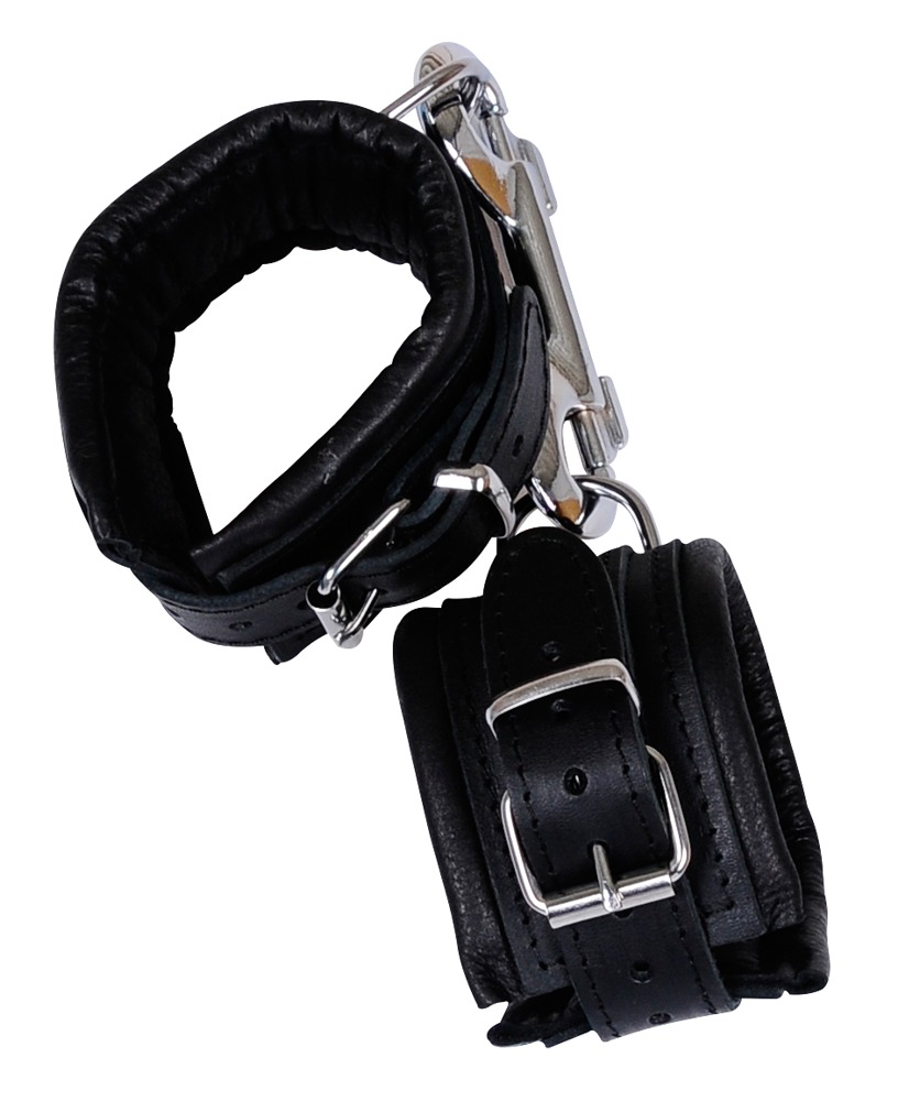 Wewnątrz z gładką skórą miękkie, wyściełane kajdanki w krótkiej formie - idealne do wąskich stawów i w całości wykonane z czarnej skóry. Regulowane zapięcie na klamrę. Z podwójnym karabinkiem. Materiał: skóra, dwoina, metal.