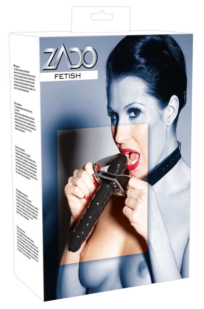 Regulowany czarny skórzany pas z odczepianym lateksowym dildo na zewnątrz i kneblem wewnątrz. Dildo o długości 13 cm, Ø 3,5 cm.