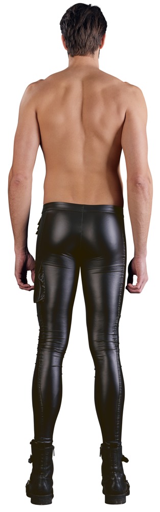 Szlachetne, wąskie spodnie o matowym wyglądzie, z kieszonką po bokach, z przeszytymi taśmami, nitami i pierścieniami. Przyjemnie elastyczny dla maksymalnego komfortu noszenia. Srebrny zamek błyskawiczny z przodu sprawia, że skalny wygląd jest doskonały.