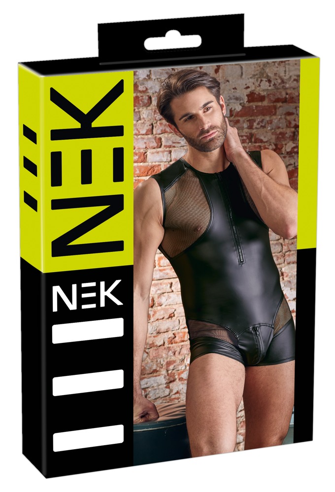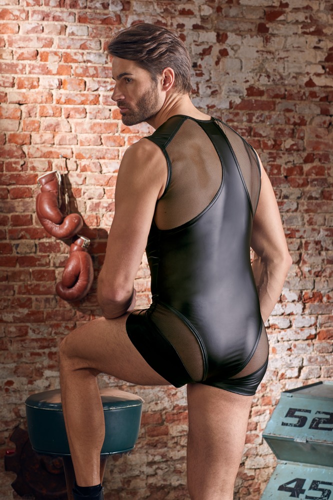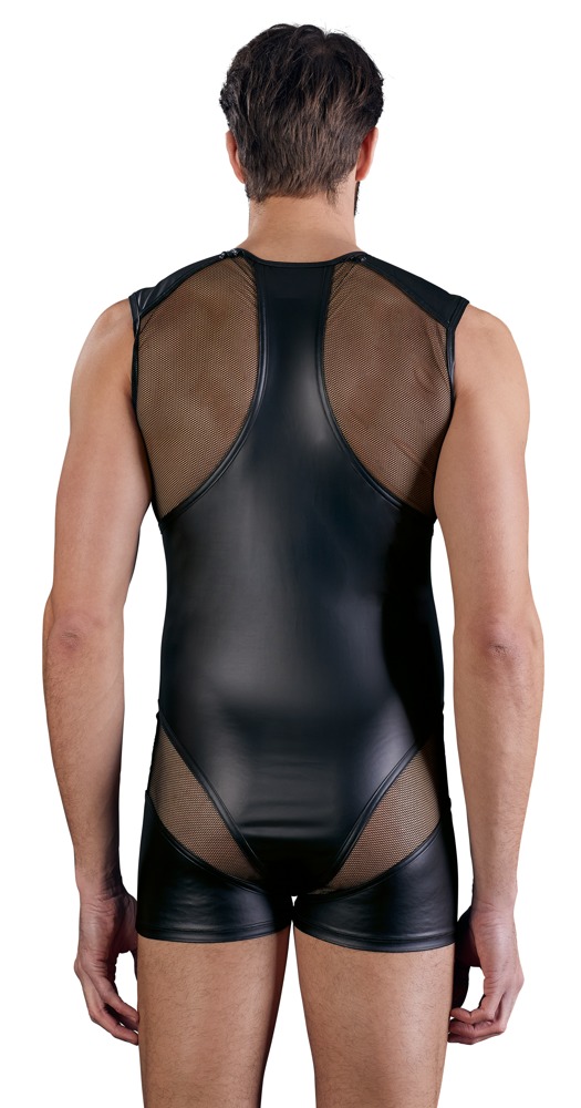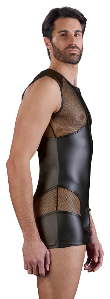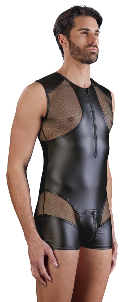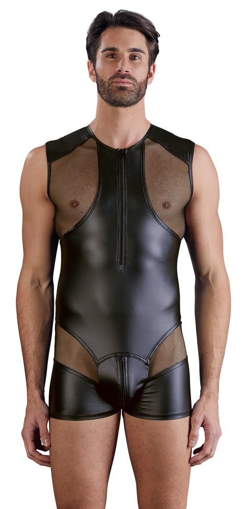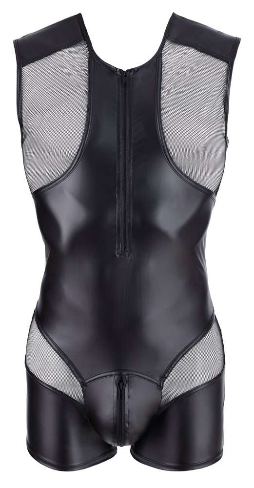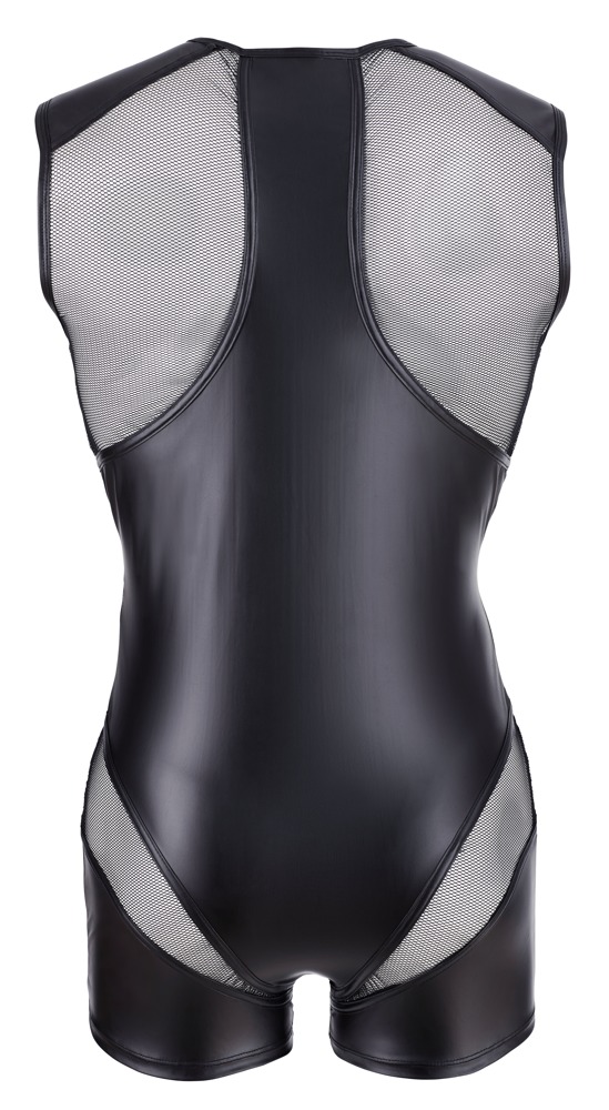 Elastyczny, krótki kombinezon o matowym wyglądzie z wstawkami z siatki z przodu i z tyłu. Zamek błyskawiczny z przodu i drugi zamek błyskawiczny na torebce dopełniają seksownego designu.