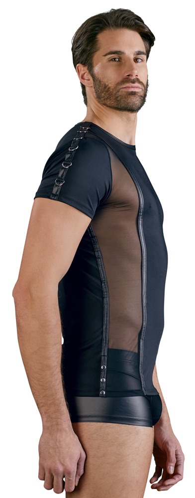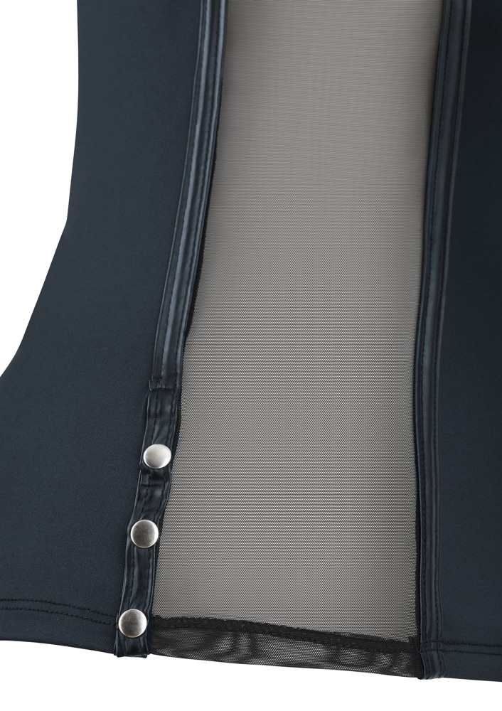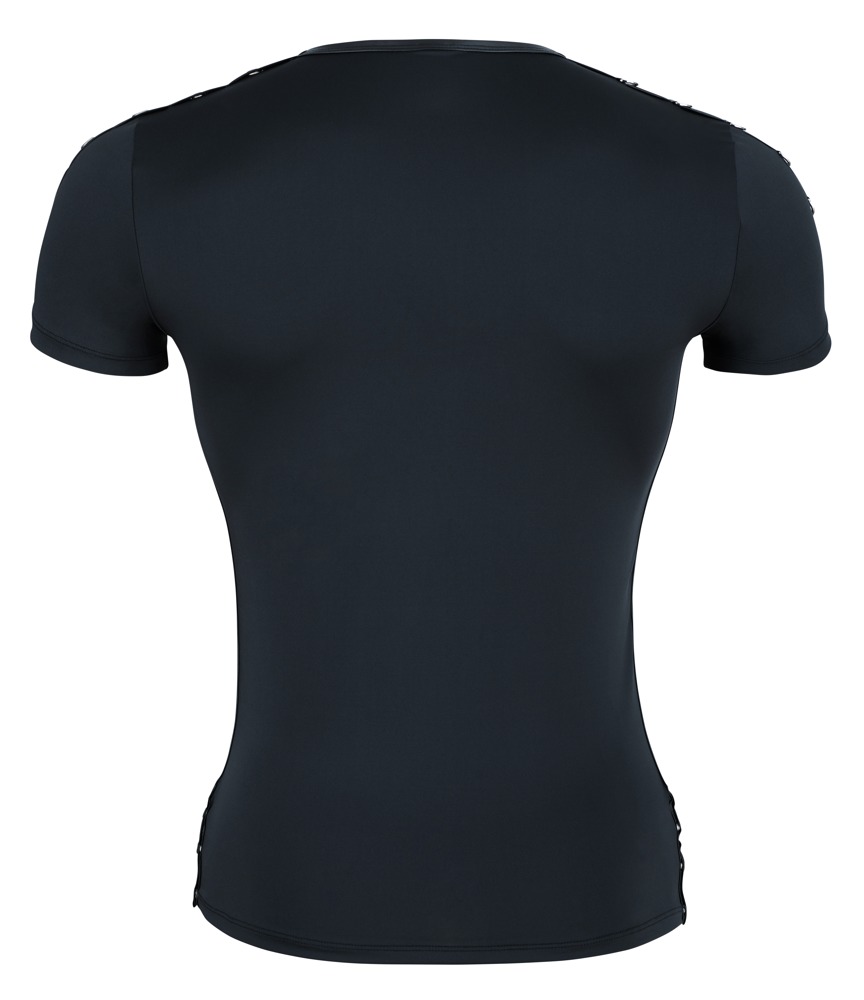 Opracuj koszulę z mikrofibry z matowymi paskami i wstawkami Powernet po bokach. Na ramionach po lewej stronie z oczkami, a po prawej z D-ringami. Z tyłu z wyrafinowanymi zatrzaskami w dolnej części bocznego szwu szczelinowego.
