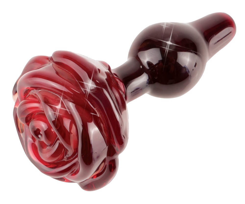 Czerwony korek analny wykonany z dmuchanego szkła z zatyczką w kształcie kwiatu róży. Bezzapachowe, antyalergiczne i bardzo higieniczne, ponieważ łatwe do czyszczenia, nawet w zmywarce. Wskazówka: Podgrzany w kąpieli wodnej lub schłodzony w lodówce, może jeszcze bardziej zwiększyć uczucie przyjemności. Przy dobrej opiece, artykuł będzie służył przez całe życie.