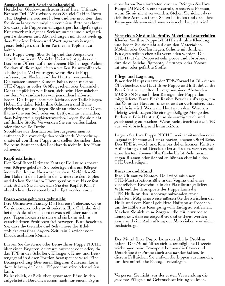 Ta naturalnej wielkości lalka miłości jest prawie nie do odróżnienia od prawdziwej kobiety! Carmen ma piękną twarz 3D z głębokimi brązowymi oczami, długimi rzęsami i pulchnymi ustami. Jej skóra jest wykonana z wysokiej jakości materiału Fanta Flesh i sprawia wrażenie absolutnie realistycznej. Podobnie, pochwa, odbyt i otwory ust są całkowicie prawdziwe w odczuciu. Nawet wargi sromowe są uwodzicielsko realistyczne. Długowłosa brunetka ma szczupłą sylwetkę z krągłymi biodrami. Obfity biust uzupełniają idealnie ukształtowane sutki. Jej szczegółowe dłonie i stopy są przekonujące aż po wypielęgnowane paznokcie. Aluminiowy szkielet wewnątrz sprawia, że Carmen jest ruchoma od stóp do głów. Śruby na podeszwach stóp pozwalają lalce stać o własnych siłach.