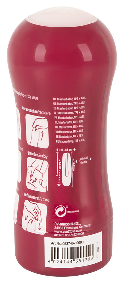Masturbator w optyce pochwy w dyskretnej, antypoślizgowej puszce. Kanał pożądania wykonany z materiału przypominającego skórę jest zaopatrzony od wewnątrz w wyraźnie zorganizowane rowki i nuby stymulujące, które zapewniają intensywny, orgazmowy masaż podczas pracy z ręką. Dzięki elastycznej puszce można łatwo zmieniać nacisk, aby uzyskać wspaniałe uczucie chwytania. Masturbator jest otwarty z tyłu w celu łatwego czyszczenia i można go wyjąć z puszki.