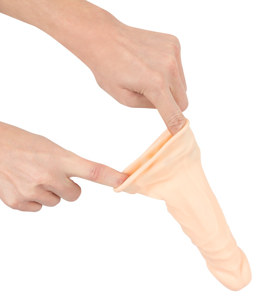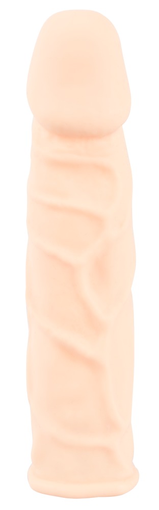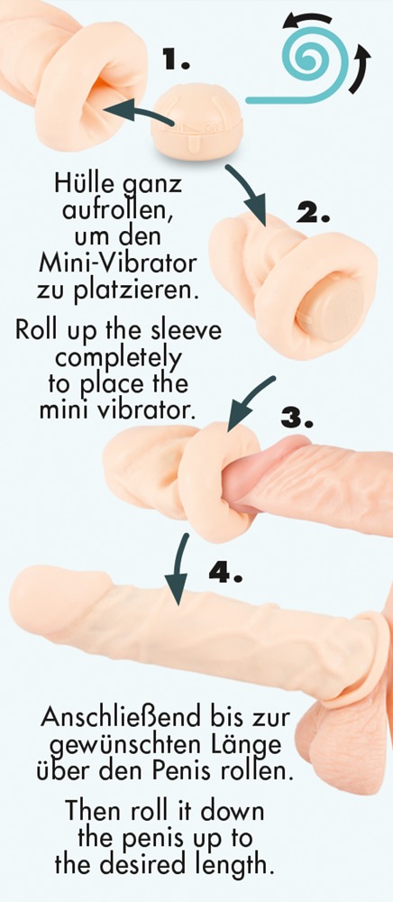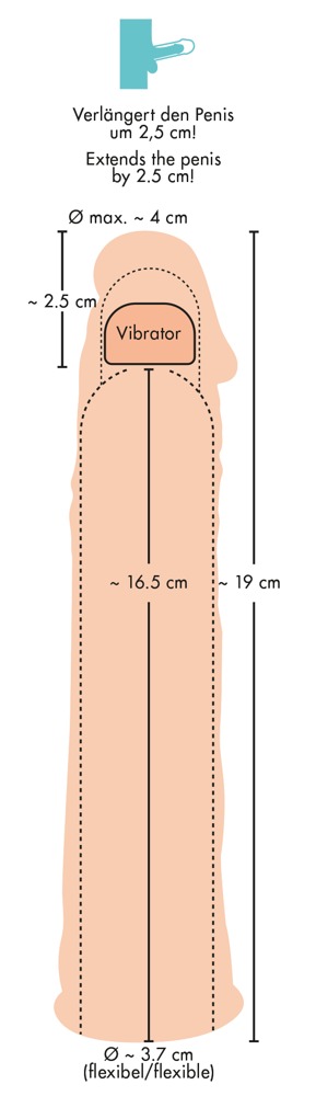 Pokrowiec na penisa wykonany z super miękkiego materiału i z bezstopniowo regulowanymi wibracjami. Wydłuża penisa o 2,6 cm i stymuluje partnera i użytkownika penisa zmysłowymi wibracjami. Z wyraźnymi żołędziami i żyłkami - jedwabiście gładkie w środku. Rękaw jest przyjemnie elastyczny i elastyczny. Baterie w zestawie (2x2 CR2032).