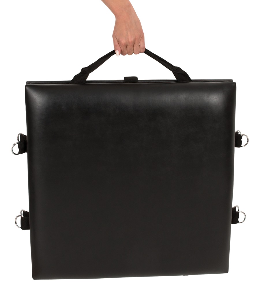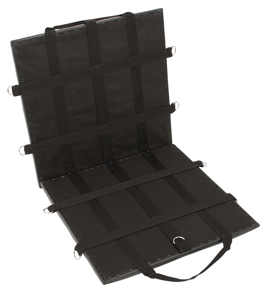 Płyta wiązania z 2 płytami 60 x 60 cm (rozłożonymi na 120 cm), w tym 4 wyściełane mankiety na ramiona (długość 39 cm, szerokość 6 cm), 4 wyściełane mankiety na nogi (długość 56 cm, szerokość 6 cm), 1 mankiet na szyję (wysokość 5,5 cm) i 1 knebel na usta (Ø 4,1 cm) z regulowanym paskiem. Bicz przekonuje długością 38 cm. Maska oczna jest wyposażona w rozciągliwy pasek.