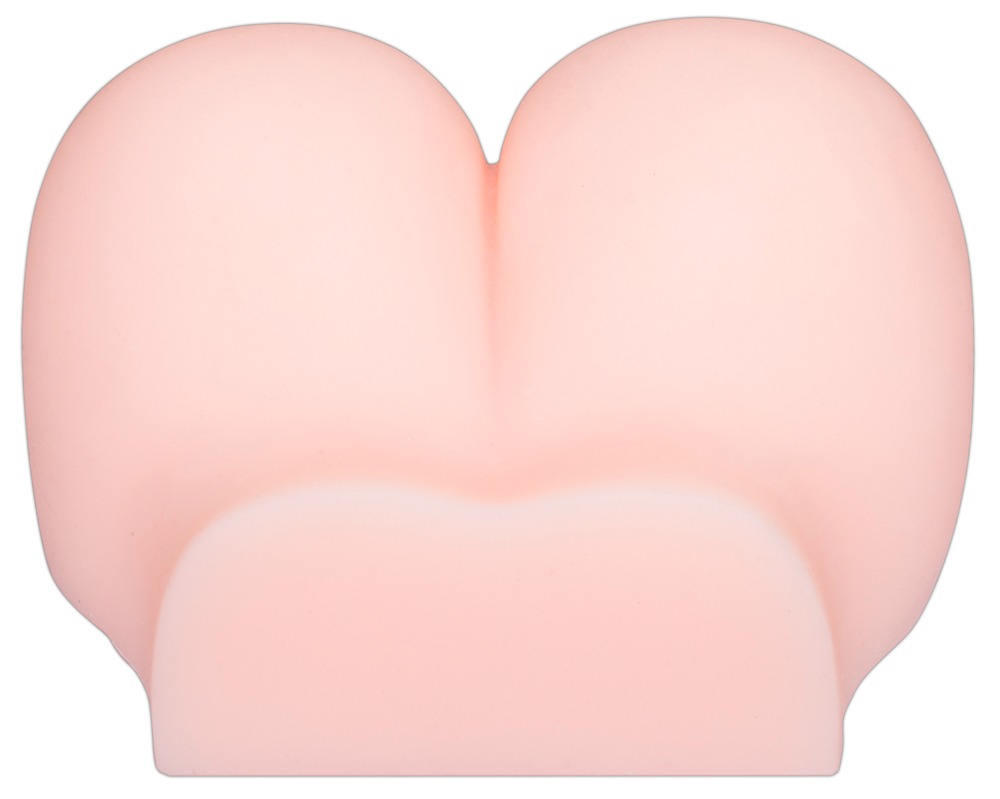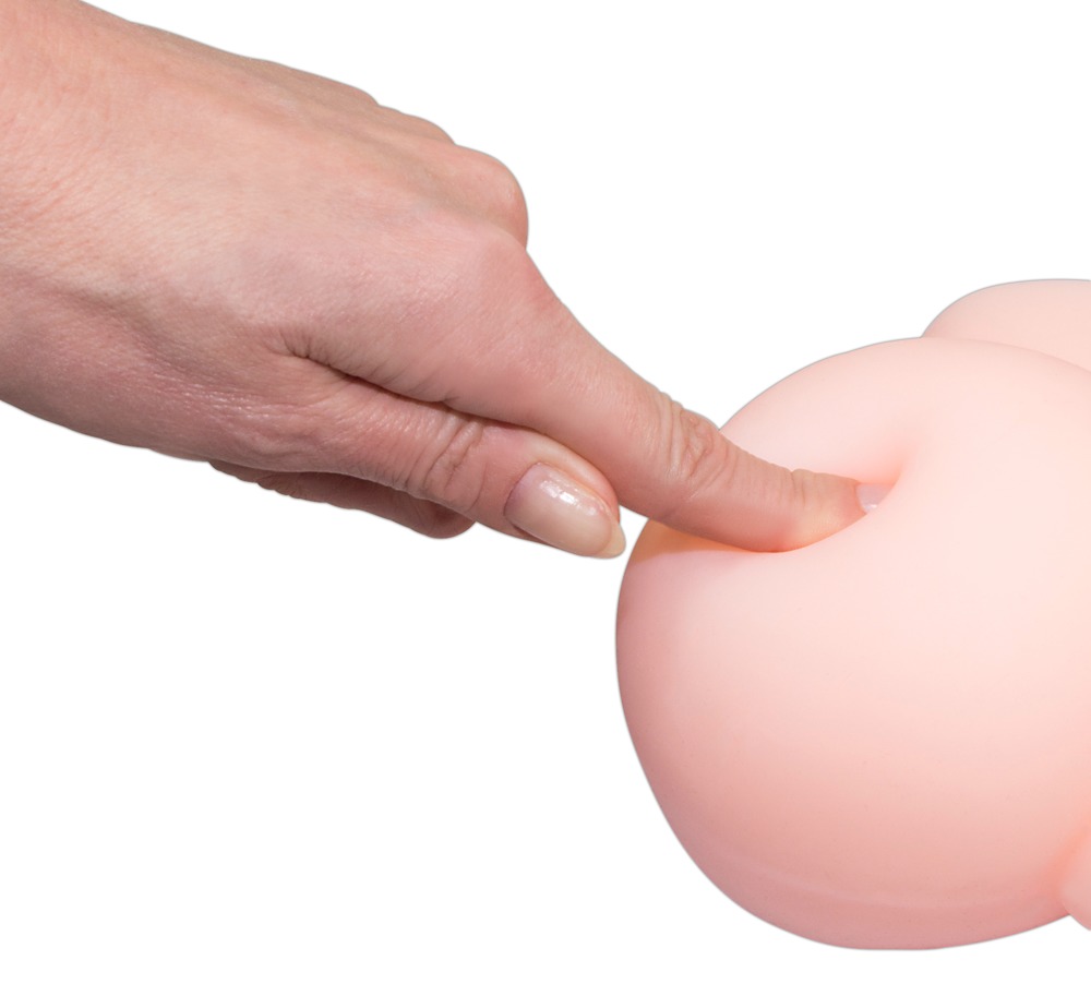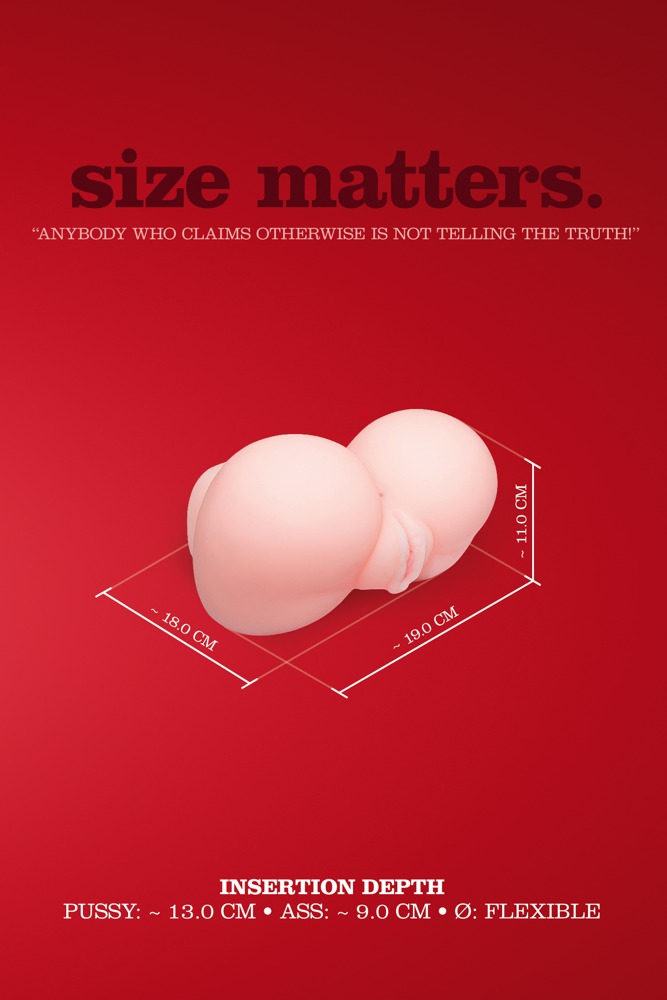Masturbator w kolorze skóry w kształcie tyłka z detalem pochwy i otworem na odbyt z kanałami przyjemnościowymi otwartymi po obu stronach: kanał pochwowy kolcowany od wewnątrz (głębokość 13 cm), kanał odbytowy rowkowany od wewnątrz (głębokość 9 cm). Z 2 małymi dodatkowymi otworami, np. na wibro-buloty (nie dołączone).