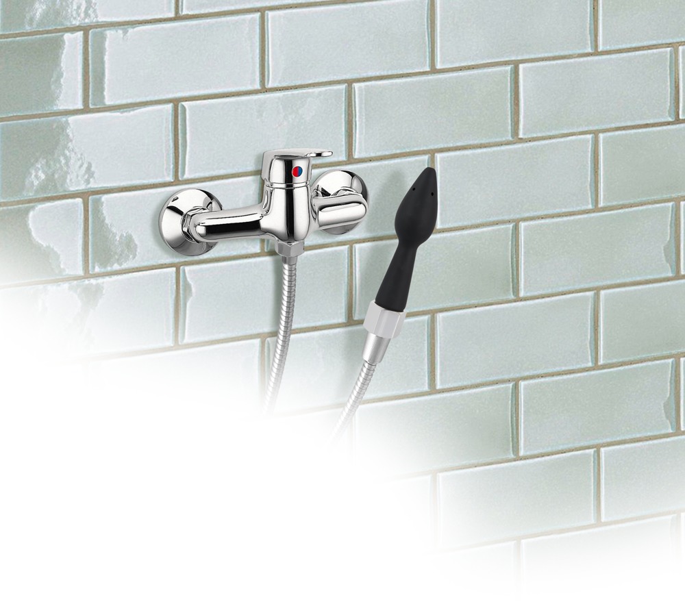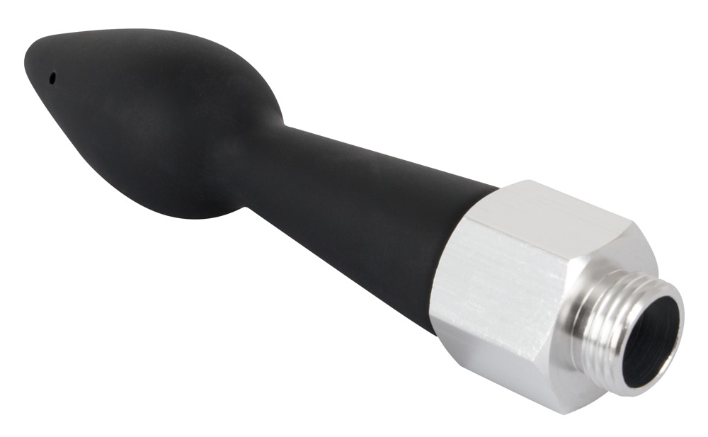 Wystarczy przykręcić wąż prysznicowy do gwintu śruby natrysku intymnego i gotowe: Powoli aksamitnie miękka powierzchnia stożkowej wtyczki wykonanej z czarnego silikonu przesuwa się do miejsca przeznaczenia w celu intymnego oczyszczenia. Woda tryska z pięciu otworów, z których jeden znajduje się w końcówce korka, w zależności od intensywności strumienia natrysku.