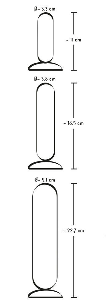 Małe dildo 11 cm długości, Ø 3.3 cm; średnie dildo 16.5 cm długości, Ø 3.8 cm; duże dildo 22.7 cm długości, Ø 5.1 cm. Materiał: TPE.