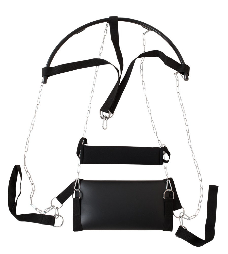 Czarna huśtawka miłosna z siedziskiem, oparciem i zdejmowanymi pętlami na nogi. Odpowiedni dla stylu psa i pozycji misjonarza. Możliwość obciążenia do 100 kg. Brak akcesoriów montażowych.