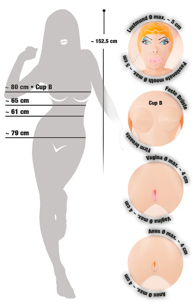 Długość całkowita 152,5 cm, głębokość wprowadzenia do pochwy 11 cm, głębokość wprowadzenia do odbytu 13 cm, głębokość wprowadzenia do jamy ustnej 11,5 cm. PVC.