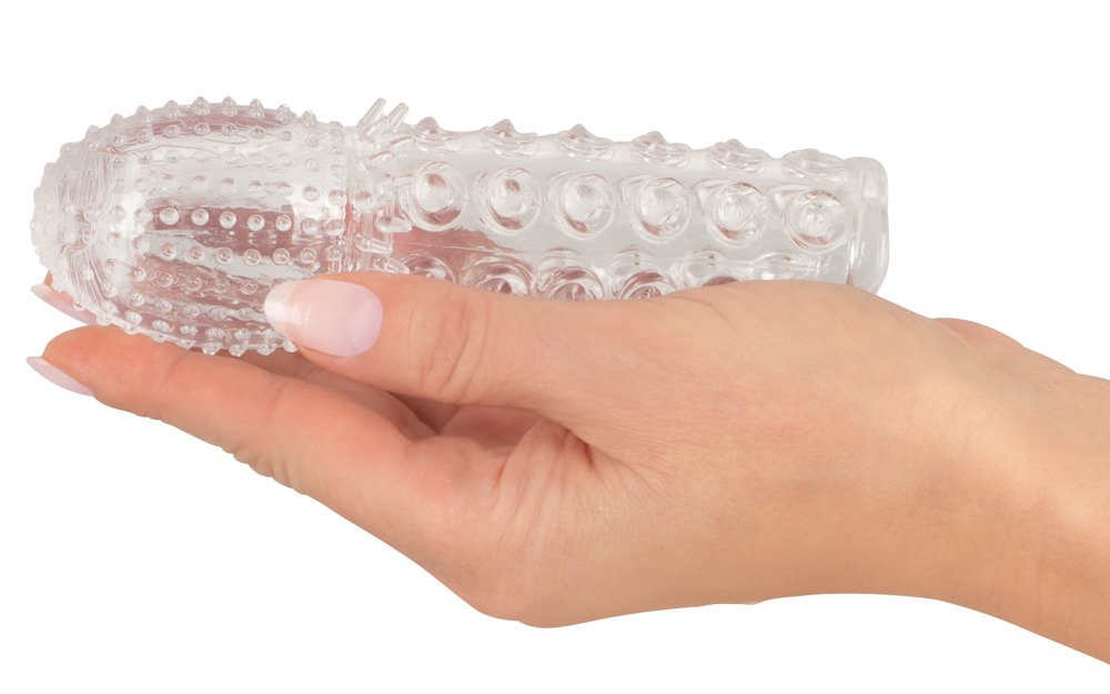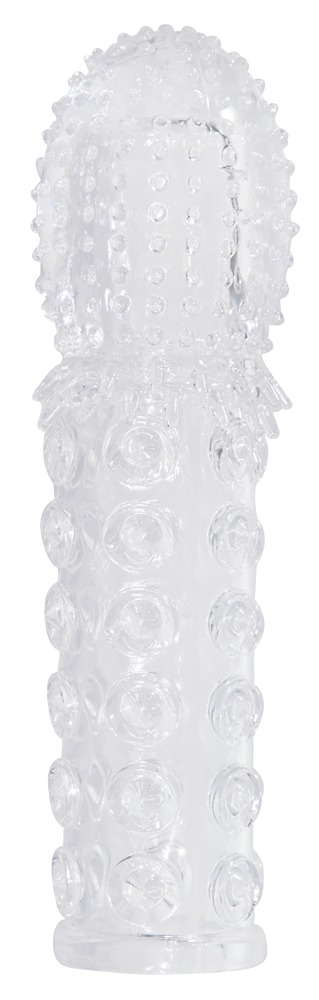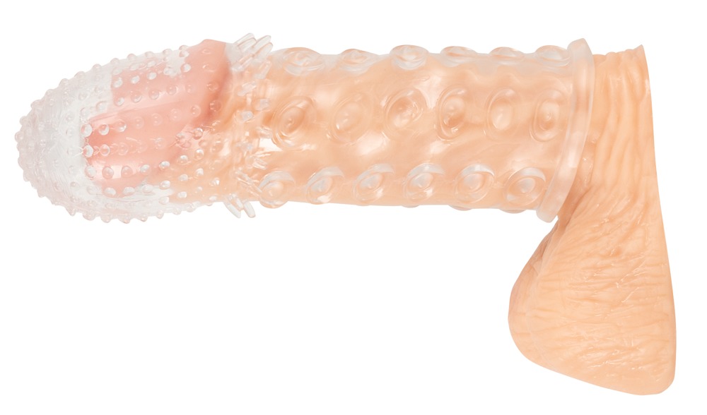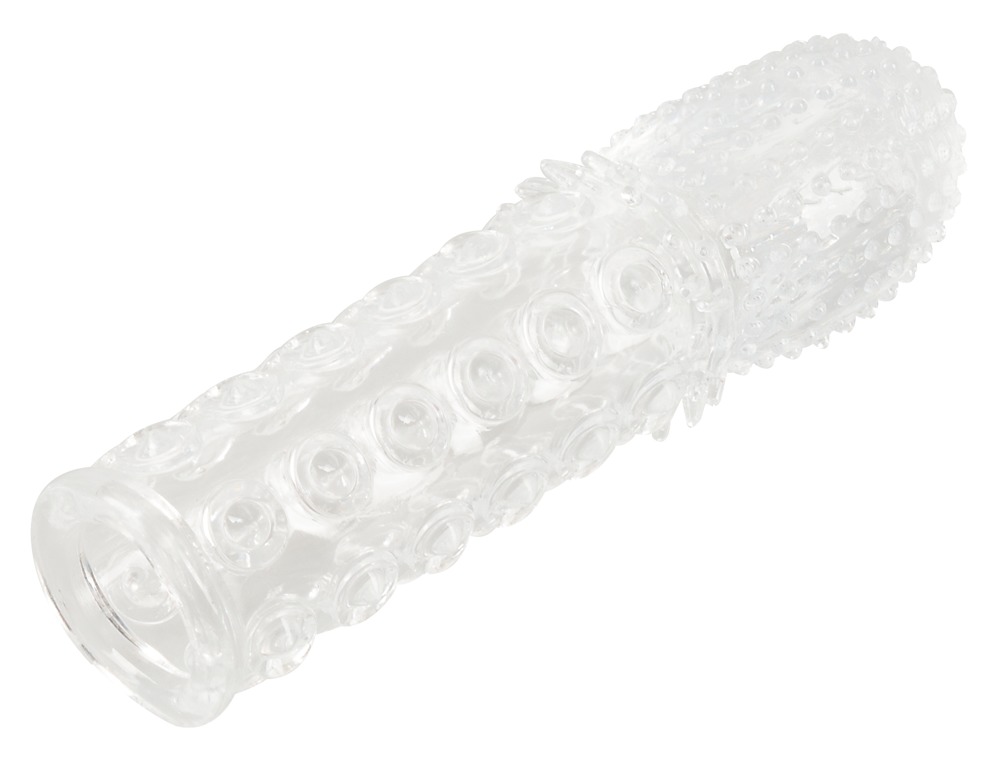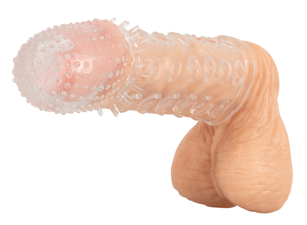 Przezroczysty płaszcz penisa z miękko wyściełanym 2,5 cm przedłużeniem i charakterystyczną strukturą stymulującą.