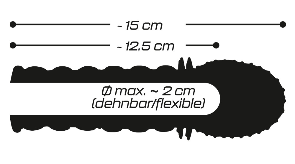 Długość całkowita ok. 15 cm, Ø 4 cm (końcówka) i 3,5 cm (płaszcz). Bardzo elastyczny. Materiał: TPE.