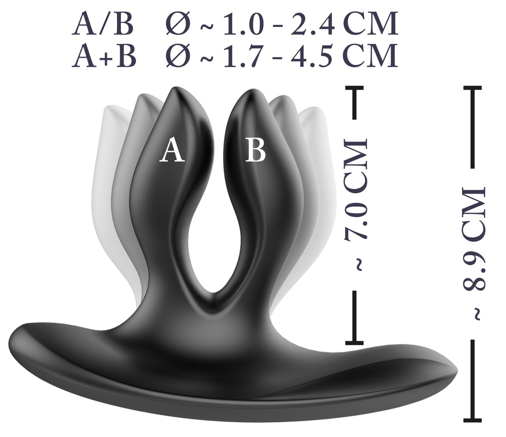 Długość całkowita 8,9 cm. Pręt krocza o długości 9,8 cm. Długość wkładki na jedno ramię 5,2 cm, na oba ramiona 7 cm. Ramiona Ø 1,0 cm do 2,4 cm każde, oba ramiona razem maks. 4,5 cm. Silikon, PU, ABS.