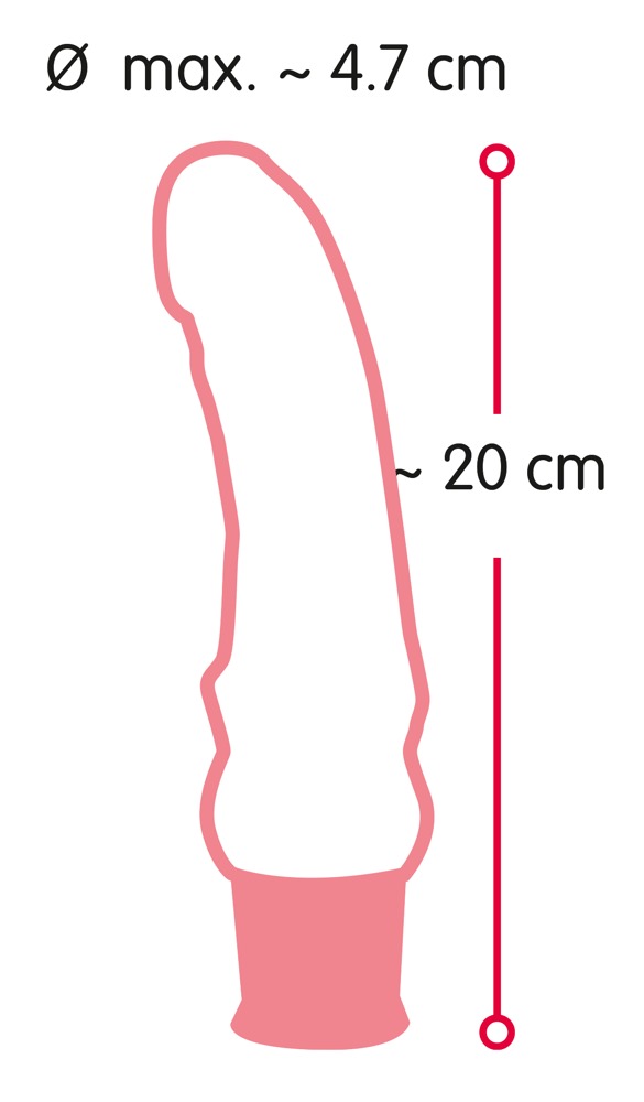 Długość całkowita 20 cm, Ø 3,5-4,7 cm. 8 trybów wibracji za jednym naciśnięciem przycisku. Materiał: TPR. (Prosimy zamawiać osobno baterie: 2 x Mignon/AA)