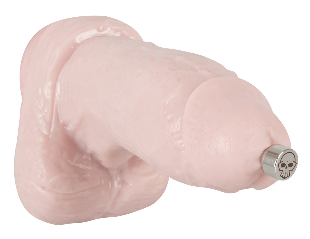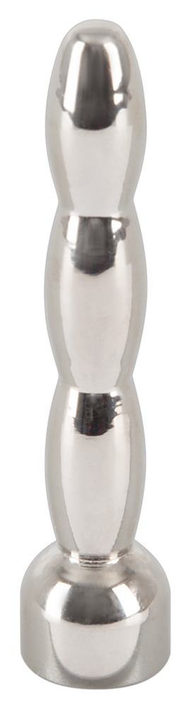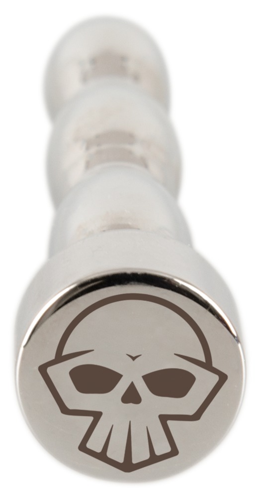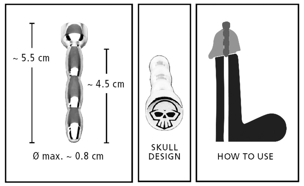Srebrny, falisty korek penisa z czaszką na korku. 5,5 cm długości, głębokość wsunięcia 4,5 cm, Ø 0,6-0,8 cm. 23 g. Stal nierdzewna.