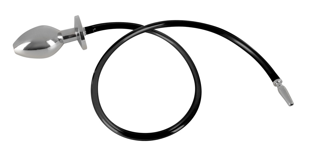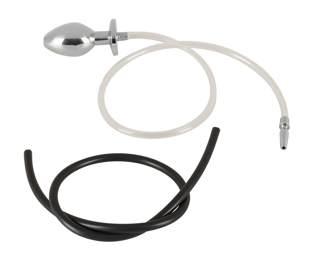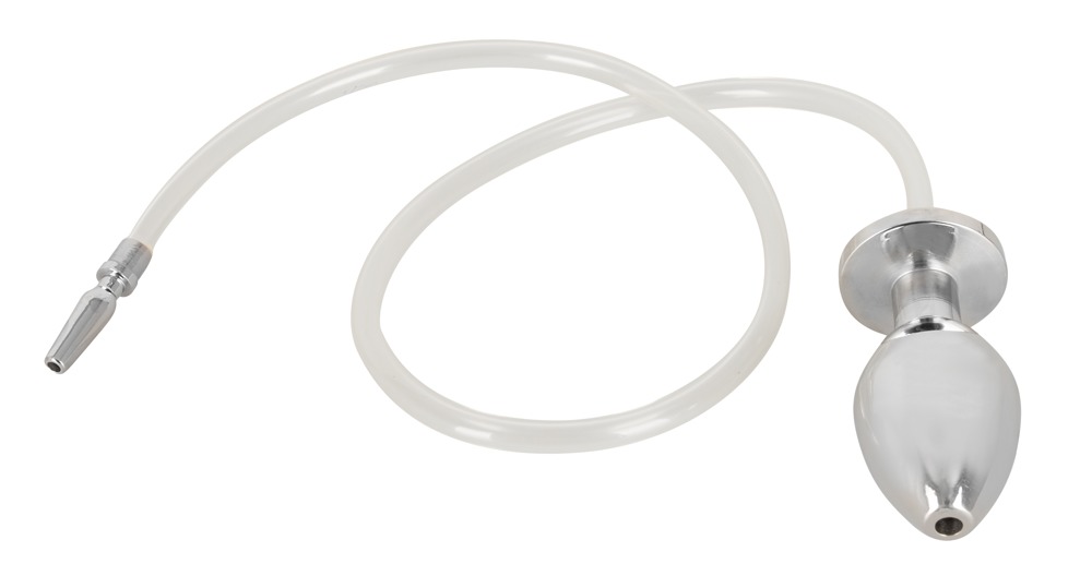 Pusta, ciężka wtyczka analna jest podłączona do otwartej wtyczki penisa za pomocą rurki. Korek analny: długość całkowita 7,8 cm, Ø max. 3,7 cm, 374 g ciężki; korek penisa: 3,3 cm, Ø max. 0,9 cm; długość rurki 62 cm. Łącznie z wymienną rurką w kolorze czarnym.