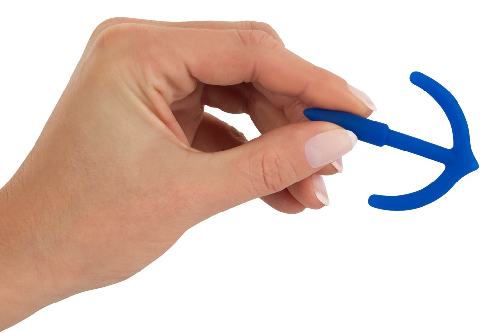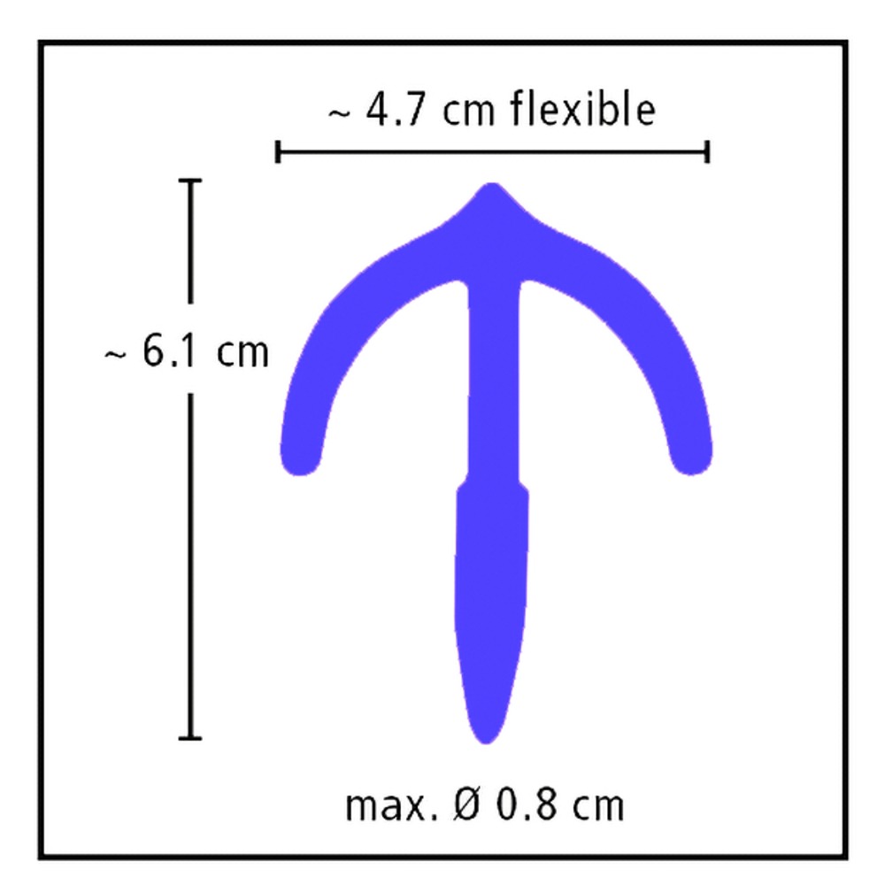 Elastyczna niebieska wtyczka penisa w konstrukcji kotwicy. Długość całkowita 6,1 cm, głębokość wsunięcia 5 cm, Ø max. 0,8 cm.