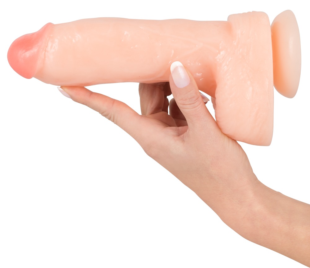 Realistyczne dildo w kształcie penisa z pulchnymi różowymi żołędziami i wyraźnymi żyłkami na wale. Ze stopą ssącą pod podręcznym jądrem.