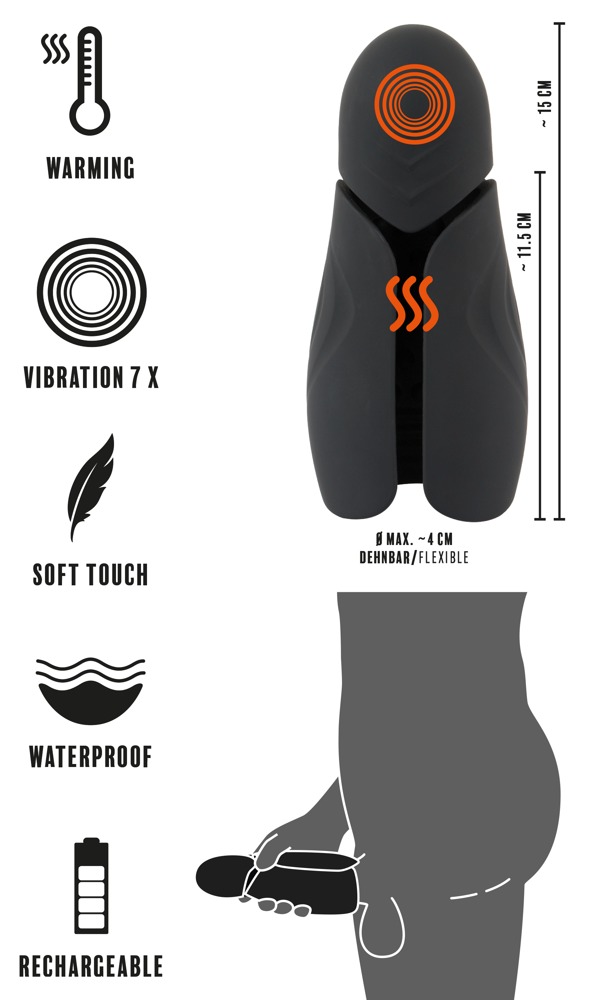 Poręczny masturbator z wypustkami stymulującymi i rowkami oraz ruchomą końcówką wyposażoną w miękkie wypustki do ukierunkowanej stymulacji żołędzi. Posiada również funkcję ogrzewania i 7 trybów wibracji, które zapewniają dużą różnorodność doznań. Obie funkcje można wygodnie kontrolować oddzielnie za pomocą jednego przycisku. Nawet w wannie lub pod prysznicem, ponieważ masturbator jest wodoodporny. Wysokiej jakości materiał silikonowy zapewnia bardzo przyjemne uczucie na skórze podczas użytkowania. Ładowalny - w komplecie z kablem do ładowania Magnetic Charger.