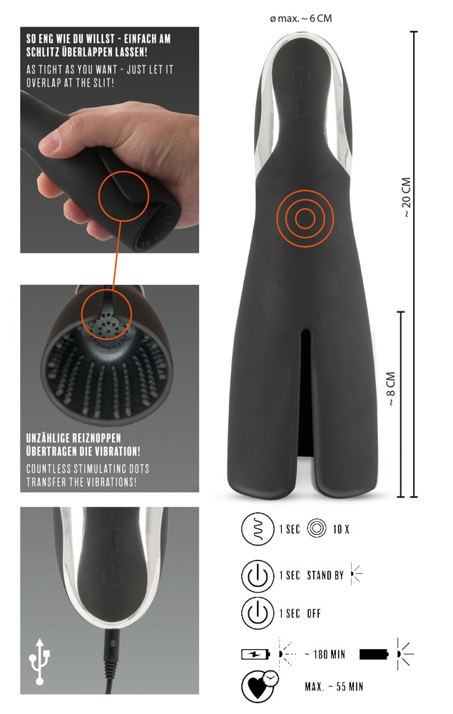 Ten silny masturbator zapewnia bardzo silne wibracje w 10 trybach dla szczególnie intensywnej stymulacji. Ponadto, nubs wewnątrz masażu i zapewniają emocje. Średnica może być regulowana przy pomocy lekkiego nacisku. Wraz z kablem ładującym USB.