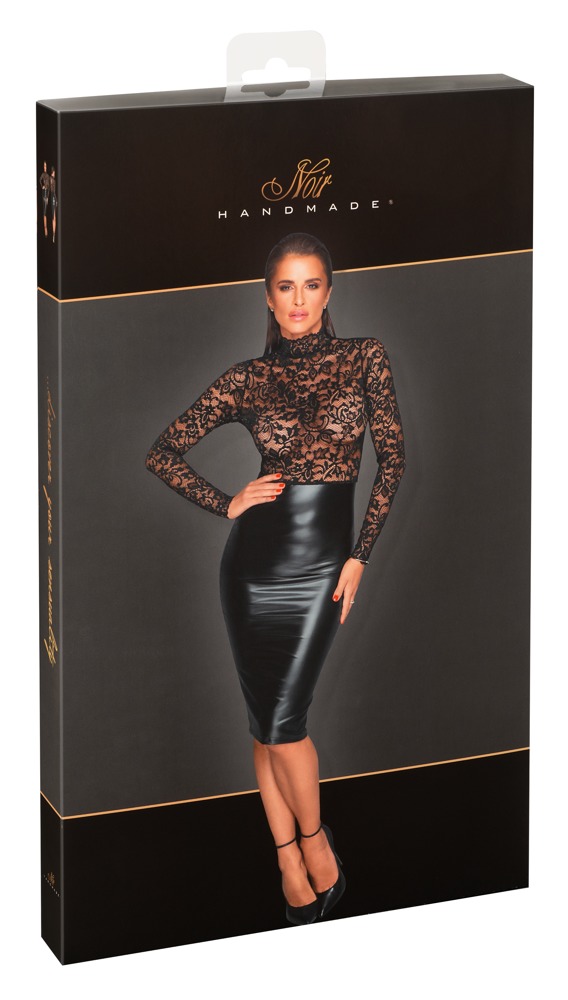 Obejmująca kolana sukienka z długim rękawem i wąską talią w czarnym szlachetnym połączeniu miękkiej koronki (góra) i matowego błyszczącego powerwetlook (część spódnicowa). Mała stójka z tyłu, zapinana na 2 guziki. Małe rozcięcie z tyłu na plecach.