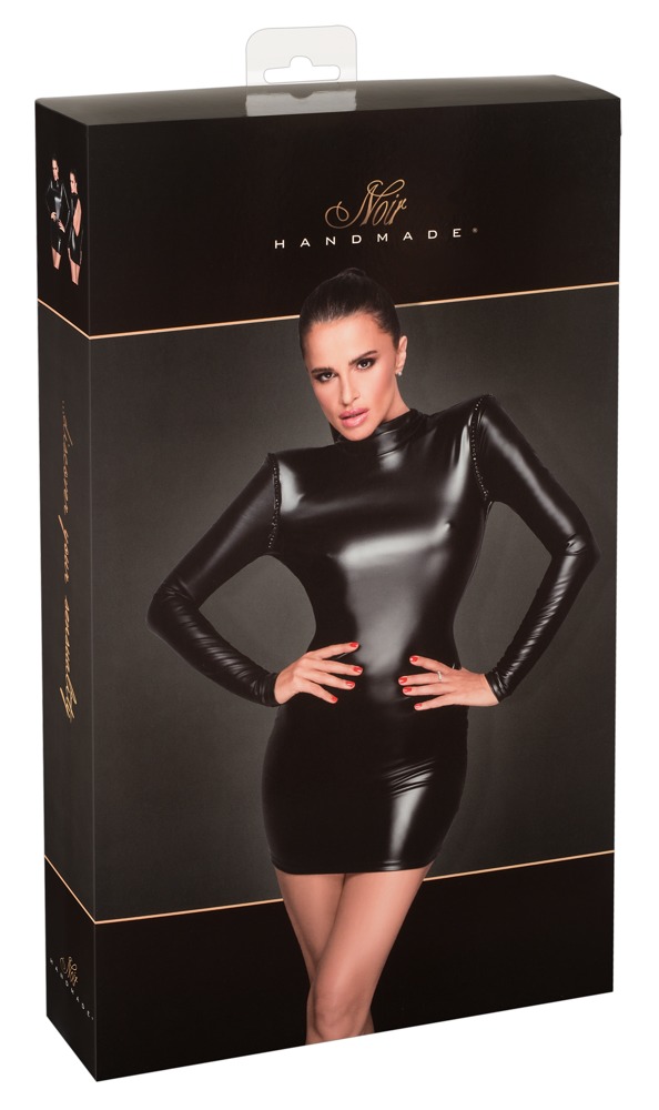 Bardzo elastyczna sukienka z długim rękawem o obcisłym kroju w kolorze czarnym o szlachetnym powerwetlook. Z tyłu bardzo duży dekolt aż do samego dołu, który jest obramowany brokatowymi kamieniami. Ozdobne brokatowe kamienie znajdują się również w górnej części wstawek na rękawach. Małe poduszki na ramionach zapewniają idealne dopasowanie. Wysoka stójka zapinana jest na trzy guziki.