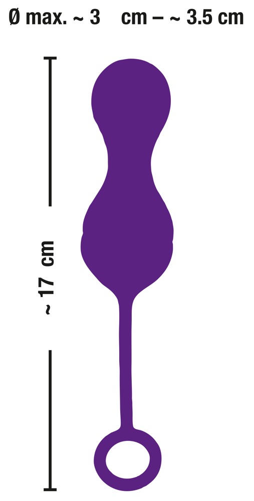 Długość całkowita 17 cm. Wibro-kulki o długości 9 cm, Ø 3 cm do 3,5 cm. Waga 73 g. Silikon, PU, ABS.