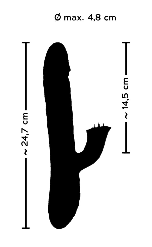 Długość całkowita 24,7 cm, długość wkładki 14,5 cm, Ø 4,8 cm. Silikon, PU, ABS.