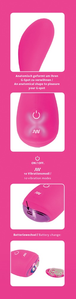 Ten wibrator o zwężającym się trzonie stymuluje punkt G dzięki grubej, zakrzywionej końcówce. Do dyspozycji jest 10 różnych trybów wibracji. Obszar wokół dwóch przycisków sterujących (on/off i wibracja) świeci się w czasie wibracji. Baterie prosimy zamawiać osobno: 2 x AAA.