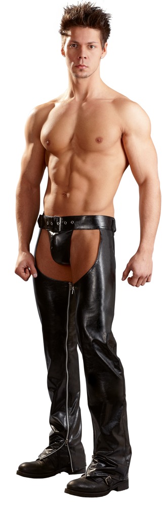 Mocny duet: czarne czapsy z dwukierunkowym zamkiem po wewnętrznej stronie nogawek i pasujące do nich gorące stringi - oba wykonane z lekko elastycznej imitacji skóry.