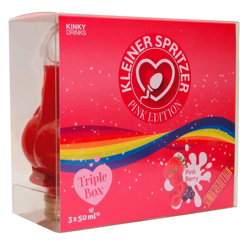 Trzy opakowania z szlachetnym likierem, wypełnione wyraźnie niejednoznaczną butelką z penisem. W owocowo różowym smaku mieszanka maliny, truskawki i czarnej porzeczki. Huk na wieczór kawalerski!